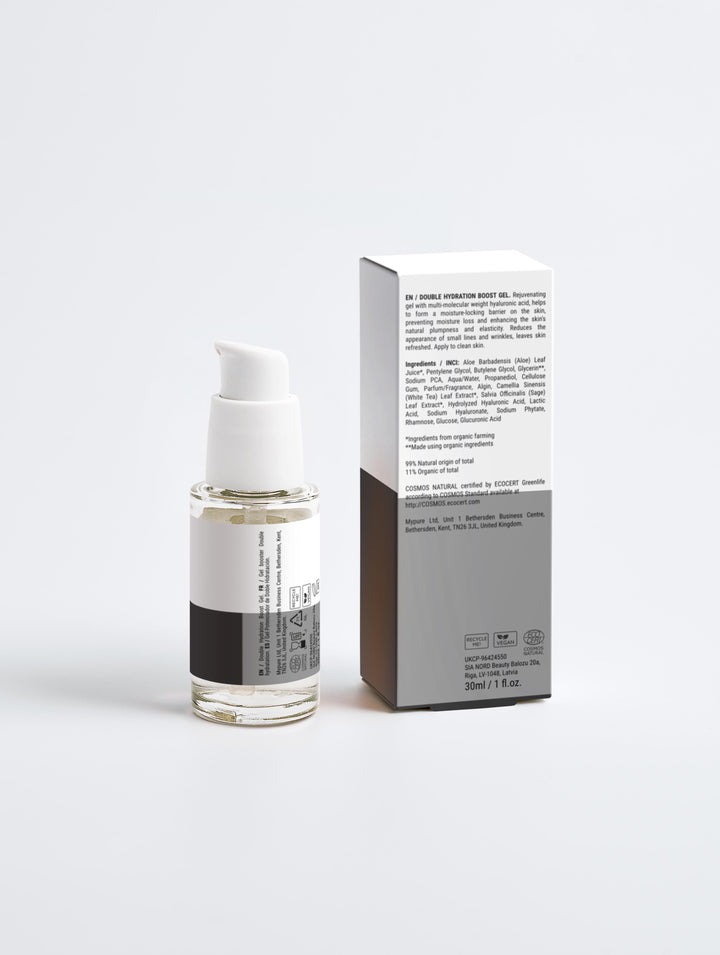 - Double Boost Hydration Gel: Features multi-molecular weight hyaluronic acid that forms a moisture-locking barrier to enhance skin's plumpness.